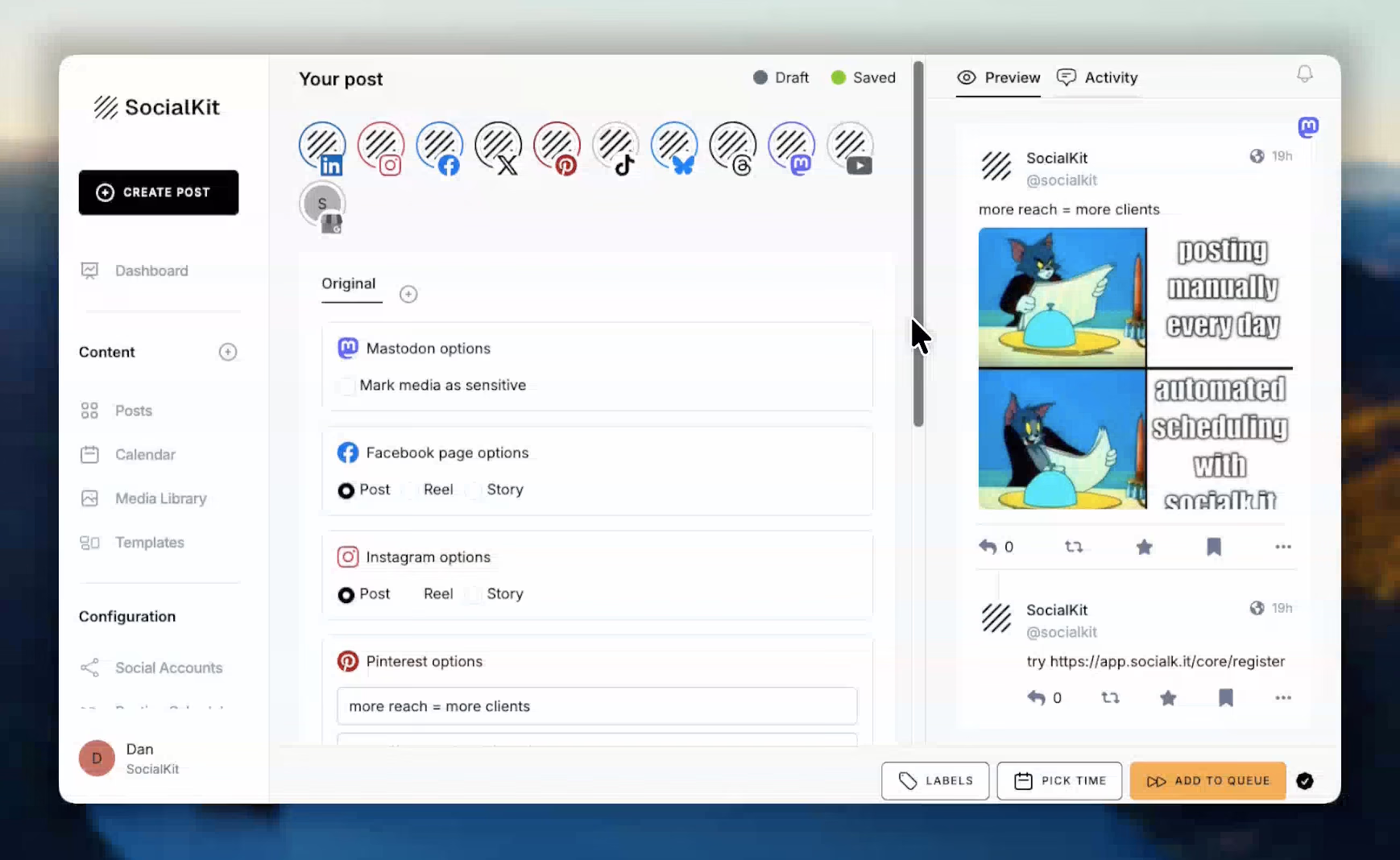 Plan your content strategy ahead of time. Schedule posts across all platforms. Customize your posts perfectly per platform. Queue up your posts and let SocialKit handle the rest.